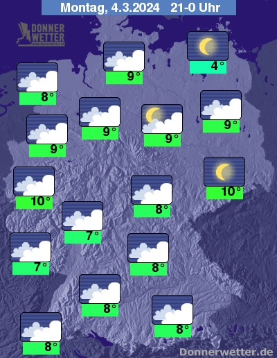 In der Nacht auf Dienstag ist der Himmel meist stark, nur im äußersten Nordosten auch gering bewölkt oder sternenklar. Entlang der Weser sowie im Südosten und Südwesten muss in der Nacht mit etwas Regen gerechnet werden, sonst bleibt es überwiegend niederschlagsfrei.