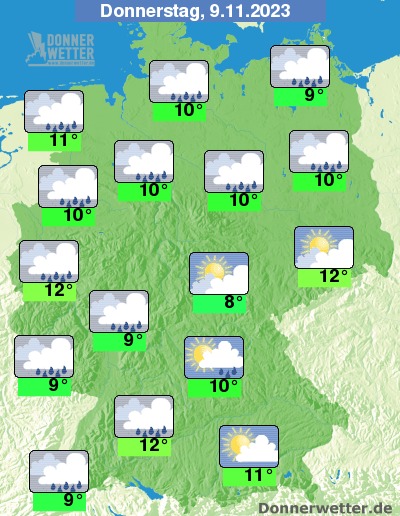 Am Donnerstag ist es bei bedecktem Himmel oder starker Bewölkung zunächst verbreitet regnerisch; Auflockerungen und Regenpausen sind im Tagesverlauf vor allem in der Nordhälfte abseits der Küsten möglich. Zum Abend hin setzt von Westen her dann neuer Regen ein. Im Südosten nimmt die Bewölkung nach einem zum Teil heiteren Start im Tagesverlauf zu, es bleibt aber meist trocken.