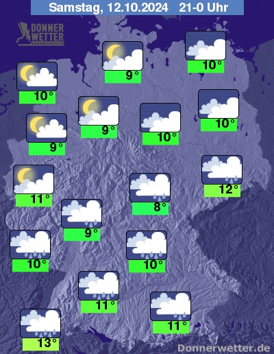 In der Nacht zum Sonntag ist es meist stark bewölkt, dabei fällt zunächst im Süden verbreitet Regen. Im Nachtverlauf greifen ostwärts ziehende Niederschläge dann auch auf den Nordwesten Deutschlands über.