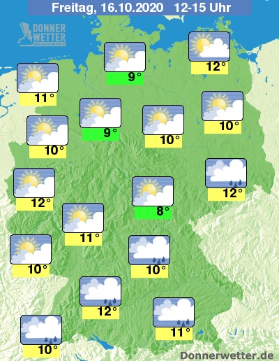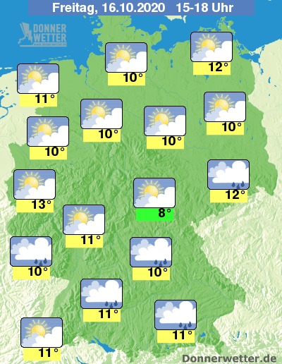 Am frühen Nachmittag halten sich von Sachsen bis zum Breisgau kompakte Schichtwolken aus denen zeitweise leichter Regen oder Sprühregen fällt. In den übrigen Gebieten trocknet die Luft ab und die Wolken machen gelegentlich der Sonne Platz.