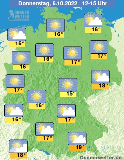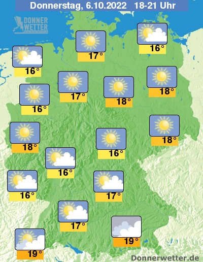 Heute Nachmittag zeigt sich das Wetter überwiegend sonnig, vor allem südlich des Mains ziehen auch teils einige Wolken durch, dabei bleibt es trocken. Die Temperatur liegt bei 16 Grad in der Norddeutschen Tiefebene und 19 Grad in München. An den Küsten weht ein oft stürmischer Wind.