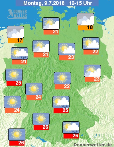 Heute Nachmittag zieht es sich im Norden von anfangs noch oft aufgelockerter Bewölkung immer weiter zu, dabei bleibt es aber größtenteils trocken. Weiter nach Süden hin scheint verbreitet die Sonne. Über Bayern können sich lokale Schauer und Gewitter bilden, sonst bleibt es aber weitgehend trocken. Die Temperatur liegt bei 17 Grad an der Nordsee und um 26 Grad im Breisgau.