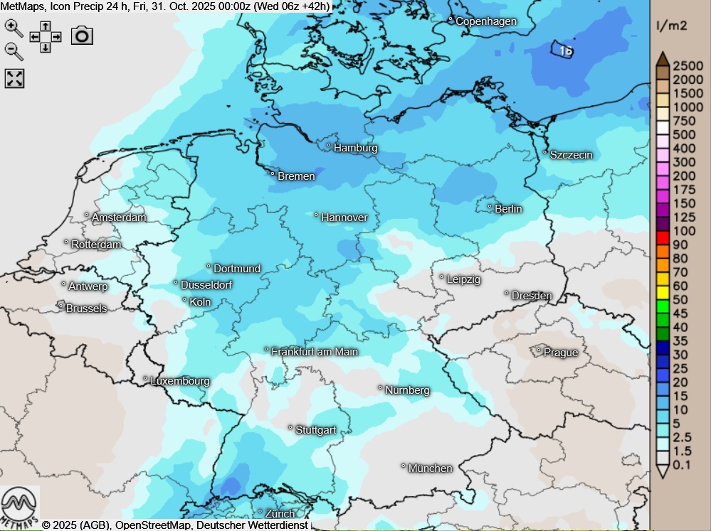 Die Strömungs- / Temperaturkarte für Donnerstagfrüh (06:00 Uhr) sowie die 24-Stunden-Regenmengen für Freitag nach Icon: