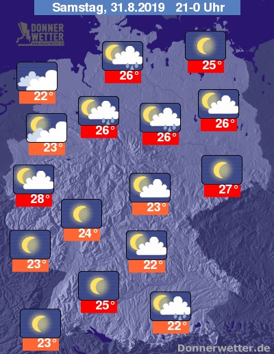 Bis zu ihrem Untergang scheint die Sonne am Samstagabend vor allem an Rhein und Oder von einem meist wolkenlosen Himmel. In den mittleren Landesteilen ist es teils heiter, teils locker bewölkt. Bis auf einzelne Schauer und Gewitter im Süden Bayerns und Baden-Württembergs bleibt es verbreitet trocken.