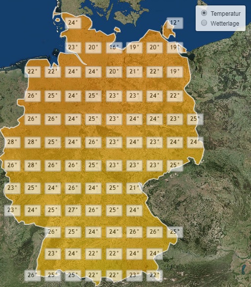 In der Mitte und im Süden fällt vielerorts auch die 25 Grad Marke. Vor allem am Niederrhein wird es mit bis zu 28 Grad sommerlich warm.