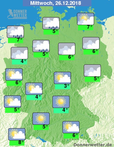 Der zweite Weihanchtsfeiertag zeigt im Norden eine dichte Wolkendecke mit Regen im Nordwesten. An der Ostseeküste zeigt sich im Tagesverlauf auch mal die Sonne. Der Süden Deutschlands ist meist heiter oder sonnig mit Höchsttemperaturen von 8 Grad C im Schwarzwald.
