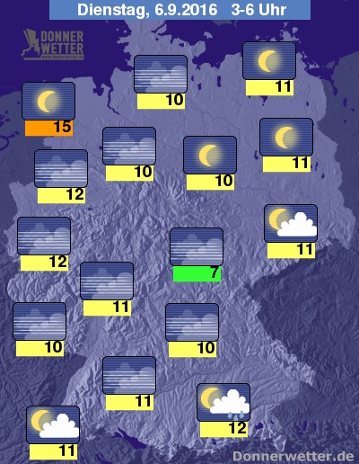 In der kommenden Nacht halten sich über dem Südosten oft dichte Wolken, dabei bilden sich hier und da einzelne Schauer. Im großen Rest des Landes zeigt sich der Himmel dagegen verbreitet sternenklar oder hier und da auch mal locker bewölkt, dazu bleibt es trocken. Stellenweise bildet sich Nebel oder Hochnebel. Die Temperatur sinkt auf 15 Grad am Dollart und bis etwa 7 Grad am Thüringer Wald.