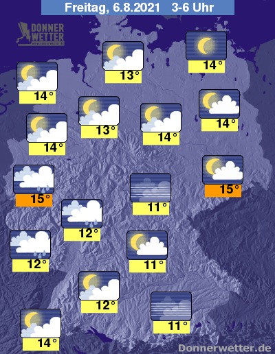 In der Nacht zum Freitag ist der Himmel über dem Land zum Großteil nur locker bewölkt und teils sogar sternenklar. In den westlichen Landesteilen ziehen jedoch oft dichte Wolke durch, dabei fällt gebietsweise Regen, im übrigen Land bleibt es hingegen trocken. Die Temperatur sinkt auf 15 Grad in Dresden und bis 11 Grad in München.