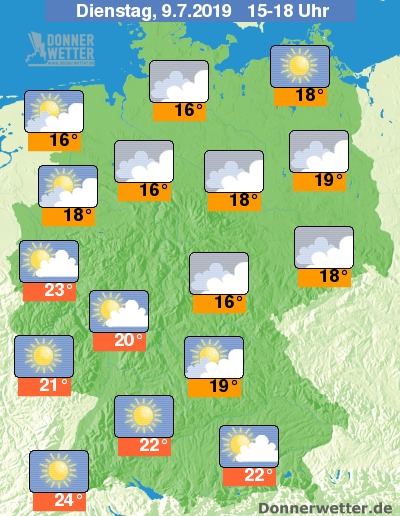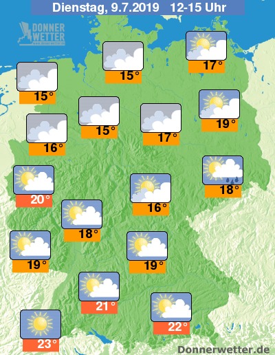 Die Temperaturen bewegen sich allgemein bei kühlen 15 bis 20 Grad. Nur im Süden und Südwesten werden angenehmere 20 bis 23 Grad erreicht.