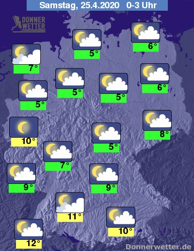 Die Temperaturen gehen auf 5 bis 9 Grad zurück. Im Süden, sowie in den größeren Städten Westdeutschlands halten sich die Werte zunächst im zweistelligen Bereich auf.