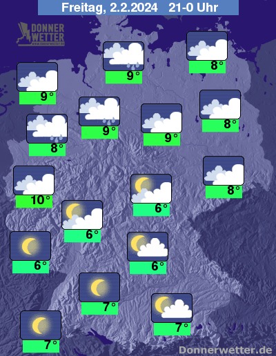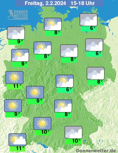 Am Freitagnachmittag und -abend beschränken sich größere Auflockerungen vor allem auf den Süden und Südwesten Deutschlands, im Norden und Osten des Landes bleibt der Himmel überwiegend stark bewölkt oder bedeckt. Es bleibt zunächst häufig trocken, zum Abend hin zieht im Norden und Nordwesten dann erneut leichter Regen auf.