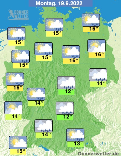 Am Montag ziehen teilweise dichte Wolken durch, teils zeigen sich Aufheiterungen. Es bilden sich gebietsweise Schauer bei Höchstwerten von 12 Grad in Mittelfranken und bis 16 Grad am Rhein.