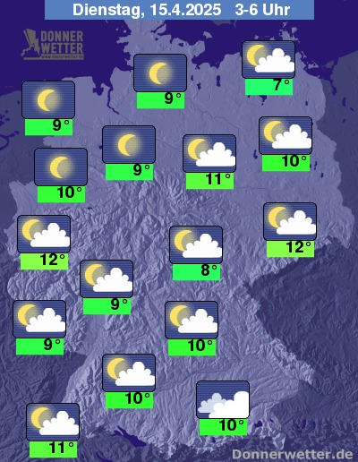 In der Nacht zum Dienstag ziehen über den Süden dichtere Wolkenfelder hinweg, es bleibt aber trocken. In den übrigen Landesteilen ist es sternenklar oder nur gering bewölkt.