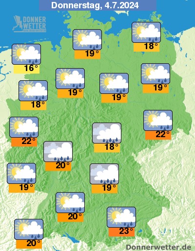 Am Donnerstag zeigt sich der Himmel wechselnd oder stark bewölkt, dabei ziehen im Tagesverlauf von West nach Ost Regengebiete durch; im Norden sind auch lokale Gewitter möglich. Vor und nach Regendurchzug sind bei auflockernder Bewölkung auch längere trockene Abschnitte zu erwarten.