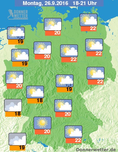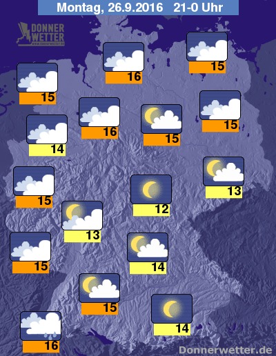 Am Montagabend zeigt sich der Himmel über weiten Landesteilen heiter bis wolkig oder aufgelockert bewölkt, dichtere Wolken finden sich im äußersten Südwesten. Einzelne Schauer sind am frühen Abend meist nur entlang der Nordseeküste sowie im Thüringer Bergland zu erwarten.