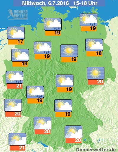 Die Temperaturen erreichen Werte um 17 Grad C in Ostfriesland und um 20 Grad C in Köln.