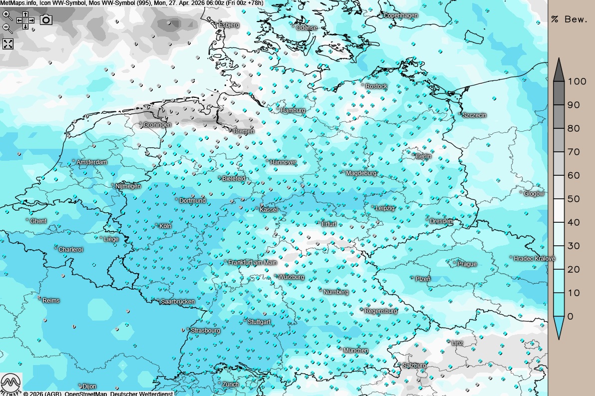 Auch zum Start in die neue Woche dürfen wir uns vielerorts über einen wolkenlosen Himmel freuen. Erst im Laufe des Tages ziehen von Nordwesten her hohe Wolkenfelder auf, die den freundlichen Charakter jedoch kaum trüben – es bleibt landesweit trocken.