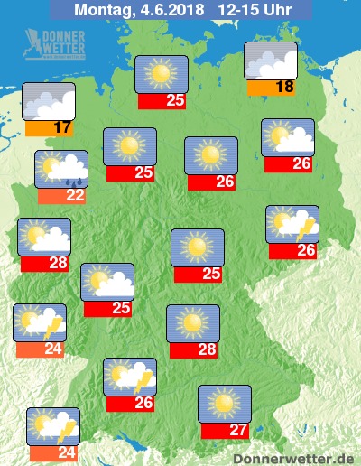 Heute Nachmittag scheint über Deutschland zum Großteil die Sonne von einem oft locker bewölktem und teils wolkenlosen Himmel. Im Nordwesten halten sich allerdings noch zum Teil dichte Wolken, die jedoch zunehmend weiter auflockern können. Im Südwesten sowie am Erzgebirge bilden sich regional Schauer und Gewitter, im übrigen Land bleibt es trocken. Die Temperatur liegt bei 17 Grad an der Nordsee und bis 28 Grad in Nürnberg.