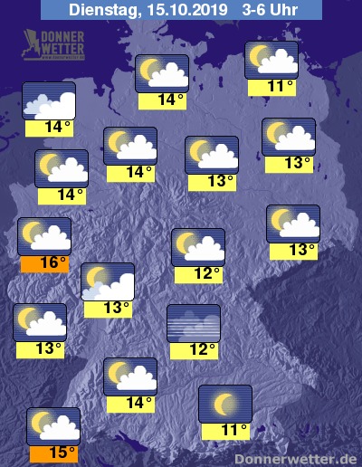 In der kommenden Nacht zeigt sich der Himmel meist locker bewölkt. Um Mittelfranken bildt sich zeitweise leichter Nebel am Himmel. Um Oberbayern ist es meist klar. Es bleibt trocken. Die Temperaturen fallen auf 11 Grad an der Ostseeküste und 15 Grad um den Schwarzwald.
