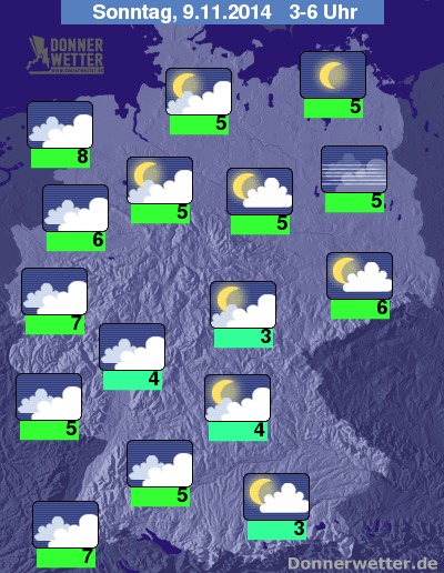 In der kommenden Nacht ist es in der Osthälfte zunächst noch meist sternenklar, im Laufe der Nacht ziehen hier wie bereits zuvor schon in den übrigen Landesteilen einige Wolken auf, nach Westen hin werden die Wolken bis zum Morgen noch dichter, dazu bleibt es jedoch trocken. Nur vereinzelt bildet sich Nebel oder Hochnebel. Die Temperatur sinkt bis zum Morgen auf 8 Grad in Ostfriesland und etwa 3 Grad im Raum München.