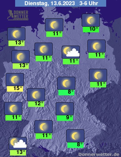 In der Nacht zum Dienstag ist der Himmel weitgehend sternenklar, nur vereinzelt können auch mal lockere Wolken durchziehen, dazu bleibt es trocken. Die Temperatur sinkt auf 15 Grad in Bonn und etwa 8 Grad in Augsburg.