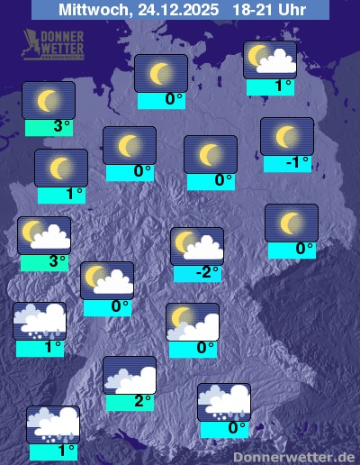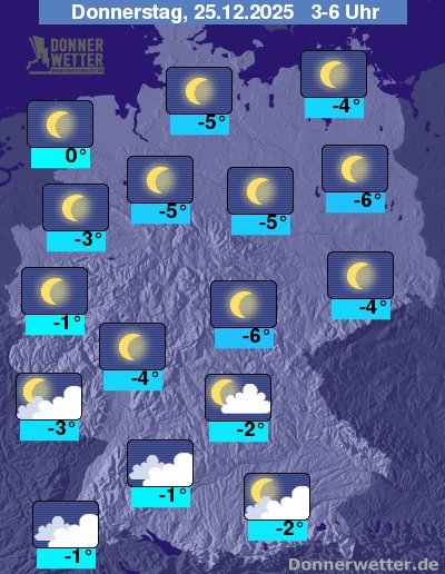 In der Nacht zum Donnerstag klingen letzte Schneefälle im äußeren Süden ebenfalls ab. Im übrigen Land ist es verbreitet sternenklar und bereits trocken. Gegen Morgen lockert der Himmel auch im Süden immer weiter auf. Die Tiefstwerte liegen bei 0 Grad in Cuxhaven und bis -6 Grad in Jena.
