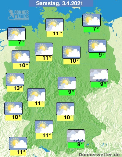 Am Samstag zeigen sich zum Teil heitere Abschnitte, vielerorts ist es aber auch stark oder aufgelockert bewölkt, dabei sind im äußeren Osten und Südosten einzelne Schauer möglich, sonst bleibt es hingegen trocken. Die Temperatur steigt auf 7 Grad an den Küsten und bis 13 Grad im Rheinland.