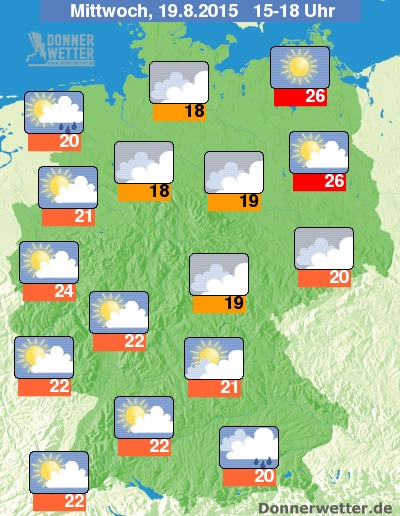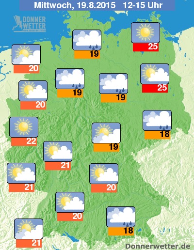 Den Westen entlang soll es am Mittwoch heiter werden. In NRW gibt es einen Wolkenlosen Himmel. In der Region Baden Württemberg wirds ebenfalls heiter, teils auch bewölkt. Kleine Schauer Wolken werden Östlich an der Weser entlang bis Magdeburg ziehen. Die Temperaturen erreichen Werte von 18 Grad C in Oberbayern bis zu 25 Grad C an der Ostseeküste.