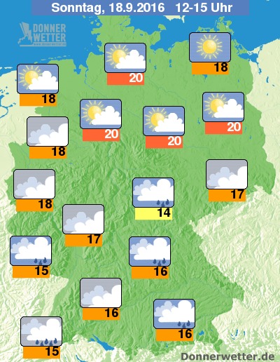 Am Sonntagnachmittag und frühen Abend zeigt sich der Himmel zwischen Ems und Oder meist heiter oder nur locker bewölkt und es bleibt trocken. In den restlichen Landesteilen überwiegen dichte Wolken, die vor allem zwischen Oberfranken und dem Chiemgau sowie am Oberrhein und in der Pfalz auch einzelne Schauer bringen können.