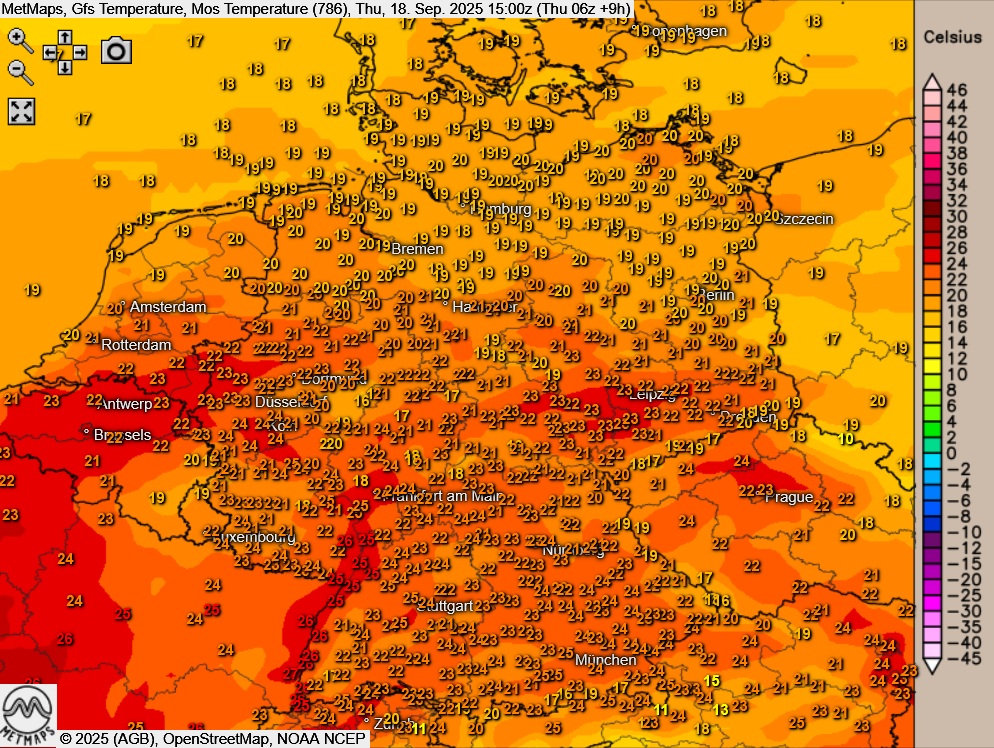 Die Temperatur- und Wetterkarte für Donnerstagnachmittag (15:00 Uhr) nach GFS: