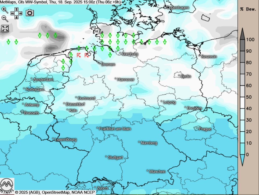 Am Donnerstagnachmittag bleibt der Himmel über dem Norden und Osten wechselnd, teils auch stark bewölkt;  dabei muss zeitweise mit etwas Regen oder einzelnen Schauern gerechnet werden. Südlich davon ist es heiter oder sonnig und es bleibt niederschlagsfrei.