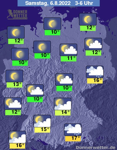 In der kommenden Nacht zeigt sich der Himmel über der Nordwesthälfte Deutschlands weitgehend sternenklar. Dichte Wolken halten sich dagegen über Sachsen und dem Südosten der Republik, dabei bilden sich einzelne Schauer, aber nur selten auch Gewitter. Im übrigen Land ist es teils stark, teils aufgelockert bewölkt, aber trocken. Die Temperatur sinkt auf 17 Grad in München und rund 10 Grad in Hannover.