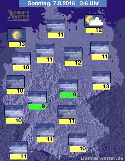 In der Nacht zum Sonntag ist der Himmel verbreitet sternenklar, direkt an den Alpen und im Küstenumfeld von Nord- und Ostsee ziehen hier und da lockere Wolken durch, dazu bleibt es aber trocken. Stellenweise bildet sich Dunst. Die Temperatur sinkt auf 13 Grad in Emden und bis etwa 9 Grad am Westerwald.