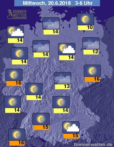 In der folgenden Nacht klart der Himmel über dem Land verbreitet auf, dazu bleibt es trocken. Die Temperatur sinkt auf 16 Grad in Bonn und bis 10 Grad an der Müritz.