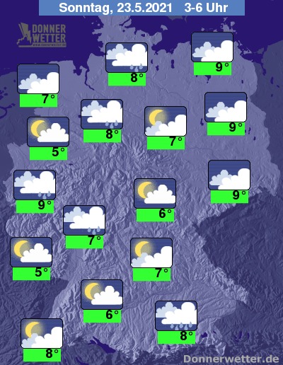 In der folgenden Nacht fällt hier und da bei dichten Wolken weiterer Regen, zumeist ist es aber locker bis aufgelockert bewölkt und dazu trocken. Die Temperatur sinkt auf 9 Grad in Berlin und bis 5 Grad in Meppen.