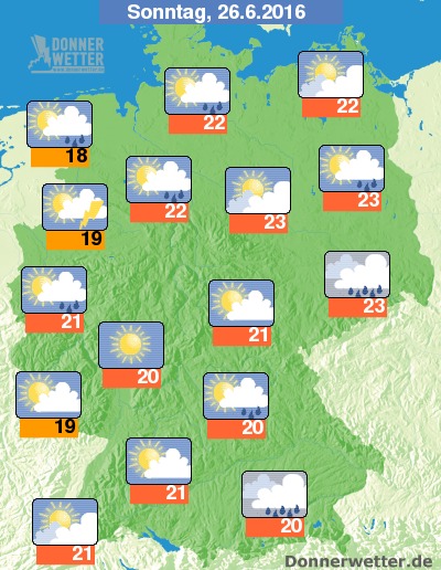 Am Sonntag fällt anfangs im Osten und Südosten unter dichten Wolken noch zeitweise Regen, sonst ist es zunächst überwiegend heiter und teilweise sonnig und dazu weitgehend trocken. Im Tagesverlauf können sich jedoch vor allem am Niederrhein und im Nordwesten des Landes Schauer und einzelne Gewitter entwickeln. Die Temperatur steigt auf 18 Grad in Emden und bis 23 Grad in Dresden.