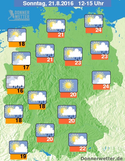Heute Nachmittag zeigen sich vor allem über der Südosthälfte Deutschlands oft sonnige Abschnitte bei hier nur örtlichen Schauern, selten auch Gewittern. Über dem Norden und Westen ziehen hingegen oft dichte Wolken durch, die hier zeitweise Schauer oder auch einzelne Gewitter bringen. Zwischendurch kann es aber auch mal auflockern oder aufheitern. Die Temperatur liegt bei teils nur nasskühlen 16 Grad im Rheinland und um 24 Grad in Stralsund.