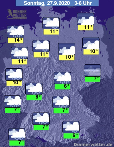 In der Nacht zum Sonntag klingen die Niederschläge zunächst im Osten und Nordosten, zum Morgen hin über der übrigen Nordosthälfte und auch im Südosten ab. Im übrigen Land fällt dagegen weiterhin zeitweise Regen, der insgesamt jedoch langsam schwächer wird. Auflockerungen zeigen sich am ehesten im Osten des Landes. Die Temperaur sinkt auf 14 Grad in Cuxhaven und bis 6 Grad in Rosenheim.