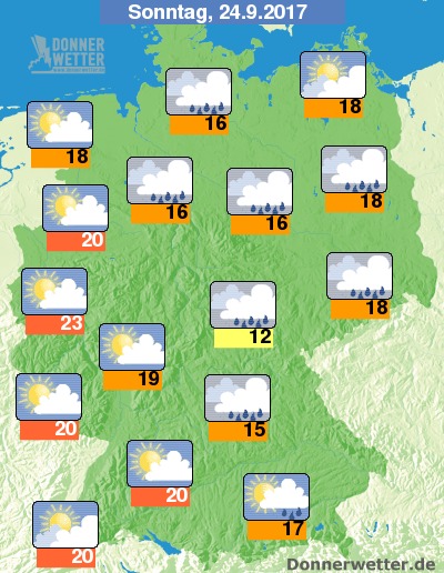 Am Sonntag zeigt sich das Wetter nur noch vom Südwesten, über den Westen bis ins Emsland heiter, teils sonnig und trocken. Im großen Rest der Republik dominieren hingegen dichte Wolken und es fällt auch immer wieder Regen. Die Temperatur steigt auf teils nur 12 Grad im Thüringer Becken und auf spätsommerliche 23 Grad in der Kölner Bucht.