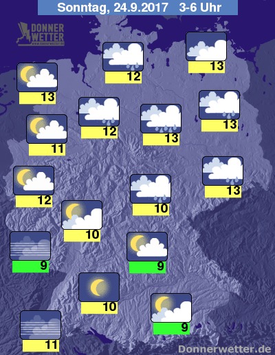 In der kommenden Nacht ziehen über die Nordosthälfte des Landes dichte Wolken mit Regen hinweg. Weiter nach Südwesten hin bleibt der Himmel hingegen locker bewölkt oder sternenklar, dazu bleibt es trocken. Die Temperatur sinkt auf 13 Grad in Berlin und bis 9 Grad im Saargau.