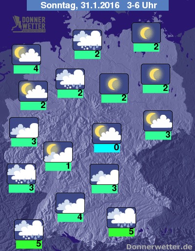 Am Sonntag ist es zunächst im Süden dicht bewölkt und es fällt zum Teil kräftiger Regen, im Tagesverlauf breiten sich die dichten Wolken und der Regen weiter nach Nordosten hin aus, vorher ist es dagegen noch wechselnd, zunehmend allerdings stark bewölkt, an der Ostsee bleibt es bis zum Abend hin noch meist trocken. Die Temperatur steigt auf 4 Grad in Oberfranken und bis 12 Grad in Aachen. Im Norden weht ein teils starker Wind.