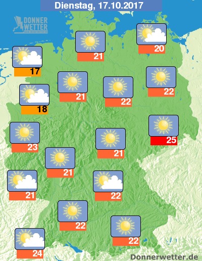 Nach Auflösung von örtlichen Nebelfeldern strahlt wieder verbreitet die Sonne im Lande. Nur über den Nordwesten und später auch über den Süden ziehen dünne Schleierwolken hinweg. Es bleibt überall im Lande trocken. Nach oft lauer Nacht, erwärmt sich die Luft bis zum Nachmittag wieder auf spätsommerliche 20 bis 25 Grad. Etwas kühler ist es bei zäherem Nebel, sowie an den Küsten und auf den Mittelgebirgen. Der Wind frischt an den Küsten zeitweise auf und kommt aus Südwest, sonst weht er meist nur schwach.