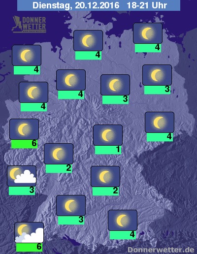 Heute Abend funkeln fast im gesamten Land die Sterne von einem weitgehend wolkenlosen Himmel. Im äußeren Südwesten halten sich noch oft einige Wolken, dabei bleibt es aber ebenso trocken. Die Temperatur liegt bei 1 bis 6 Grad.