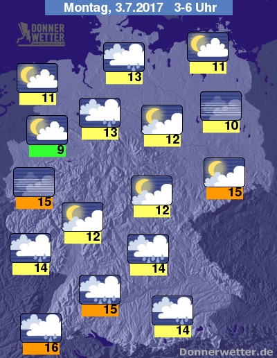 In der Nacht zum Montag halten sich besonders im Süden, zeitweise aber auch im Norden dichte Wolken aus denen es immer wieder regnen kann, sonst ist es oft aufgelockert, teils stark bewölkt, jedoch zumeist trocken. Die Temperatur sinkt auf 16 Grad in Freiburg und bis etwa 9 Grad am Niederrhein.