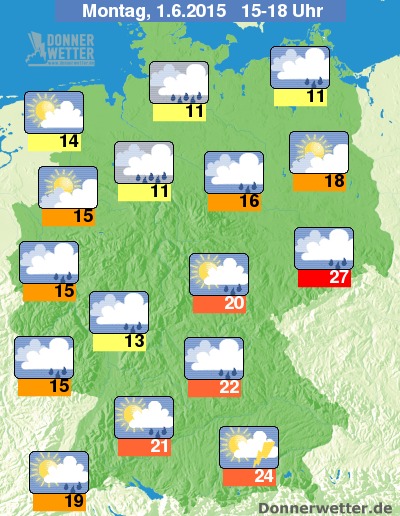 Heute Nachmittag ziehen immer wieder dichte Wolken übers Land, die zeitweise Regen, im Süden und Osten Deutschlands häufige Schauer und teils kräftige Gewitter bringen. Die Temperatur steigt auf 14 Grad im Oldenburger Münsterland und bis auf sommerliche 27 Grad in Dresden.