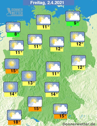 Am Freitag ist es zumeist heiter bis sonnig, gebietsweise ziehen aber auch einige, teils dichte Wolken durch. An den Alpen sind einzelne Schauer möglich, sonst bleibt es überall trocken. Die Temperatur steigt auf etwa 8 Grad an der Nordsee und bis zu 18 Grad im Oberrheingraben.