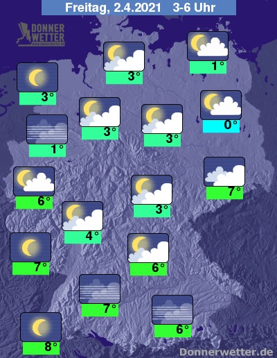 In der Nacht zum Freitag ist es im Süden und Nordwesten des Landes häufig sternenklar, sonst ist es jedoch meist wechselnd oder stark bewölkt. Über Sachsen und dem südlichen Bayern können sich vereinzelt Schauer bilden, sonst bleibt es aber weitgehend trocken. Die Temperatur sinkt auf 8 Grad in Freiburg und bis Werte um 0 Grad im Berliner Umland.