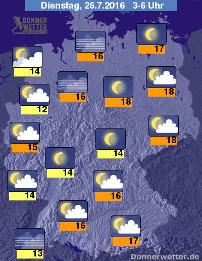 In der Nacht zum Dienstag sind anfangs im Südosten noch einzelne Schauer und Gewitter möglich, sonst zeigt sich der Himmel über dem Land zum Großteil nur locker bewölkt oder sternenklar. Besonders nach Nordwesten hin können auch mehr Wolken durchziehen, dazu bleibt es aber trocken. Die Temperatur sinkt auf 18 Grad in Dresden und bis 12 Grad im südlichen Emsland.