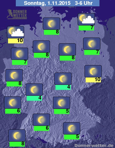 In der kommenden Nacht ist der Himmel fast über dem gesamten Bundesgebiet sternenklar, nur im Küstenumfeld von Nord- und Ostsee hält sich hier und da lockere Bewölkung, dazu bleibt es trocken. Die Temperatur sinkt auf 10 Grad an der Nordseeküste und bis etwa 4 Grad in der Wetterau. Hier und da kann sich zum Morgen hin Nebel oder Hochnebel bilden.