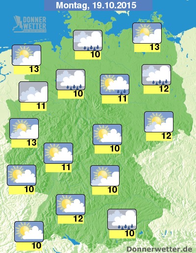 Am Montag ziehen insbesonders über den Norden Deutschlands oft dichte Wolken mit Regen hinweg. Vor allem im Küstenumfeld scheint jedoch auch zeitweise die Sonne und hier bleibt es überwiegend trocken. Dichte Wolken mit gelegentlichem Regen halten sich auch am Alpenrand und im Südosten des Landes, in den übrigen Landesteilen ist es dagegen meist locker bewölkt und dazu trocken. Die Temperatur steigt auf 10 Grad im Vogtland und bis 13 Grad in Schwerin.